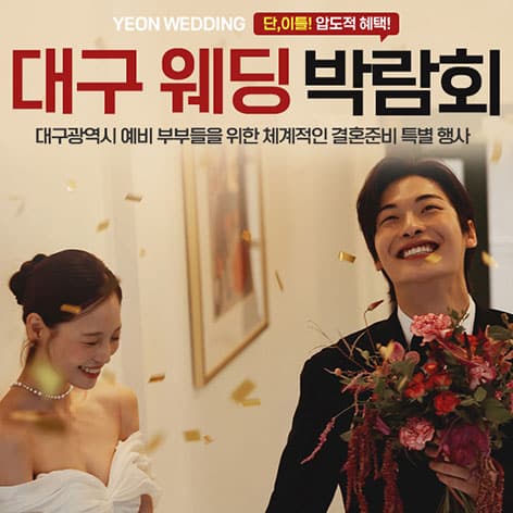 대구에서 열리는 대구 최대규모 웨딩박람회에 참여하세요! 대구 웨딩홀 최대 할인, 스드메 업체 직영 운영, 신혼여행 특별 할인, 혼수 가전 특별 할인 등의 혜택을 누리세요. 현명한 결혼 준비하세요!